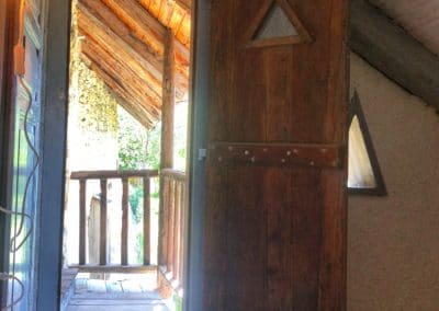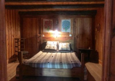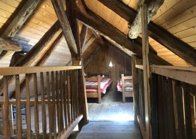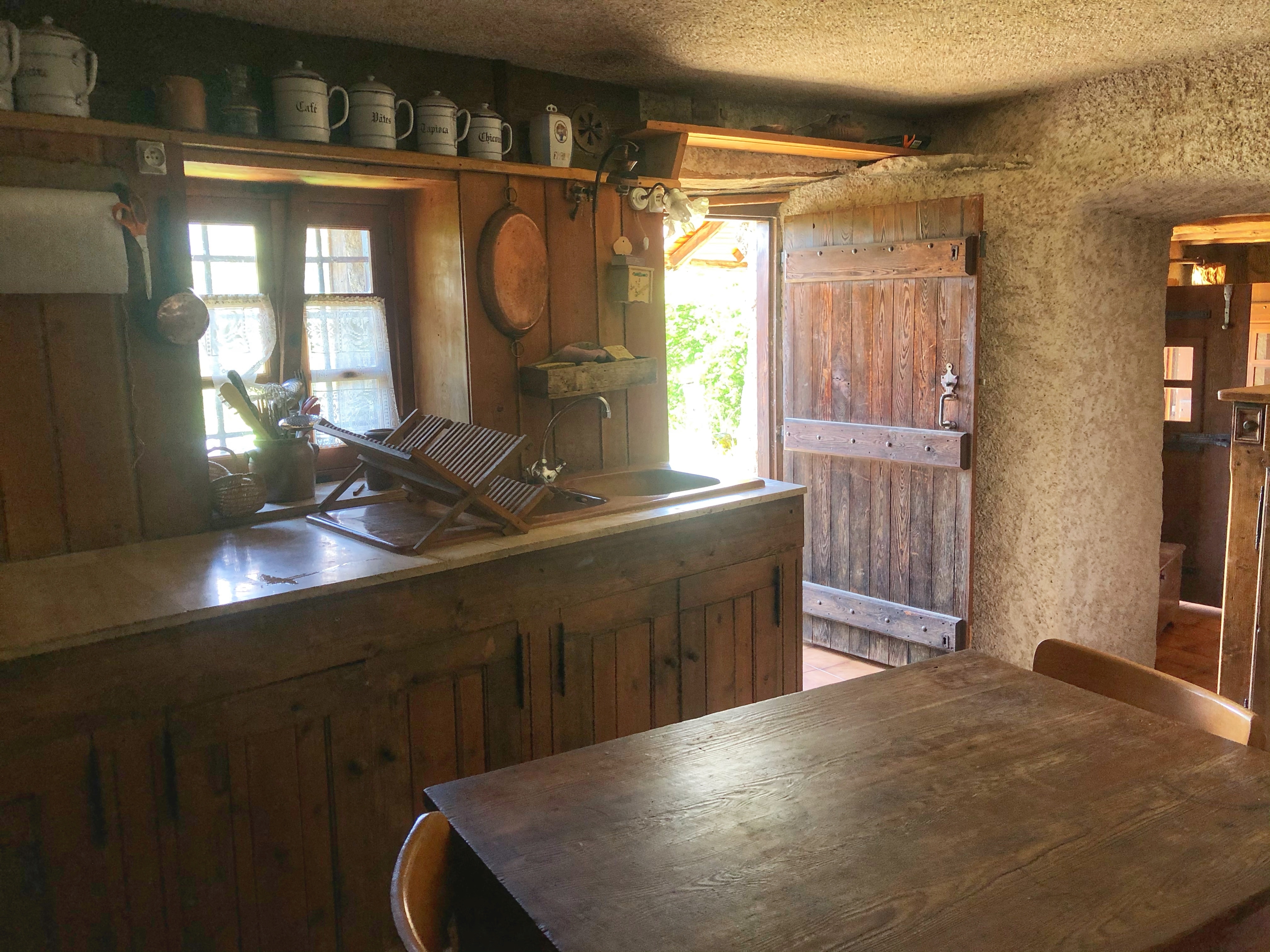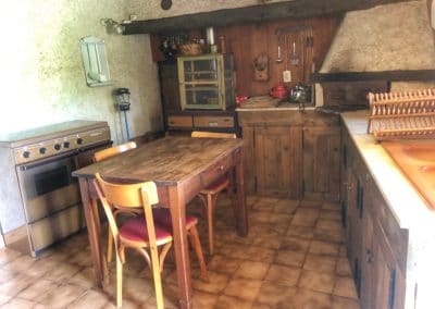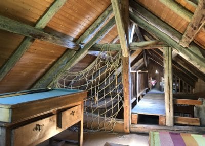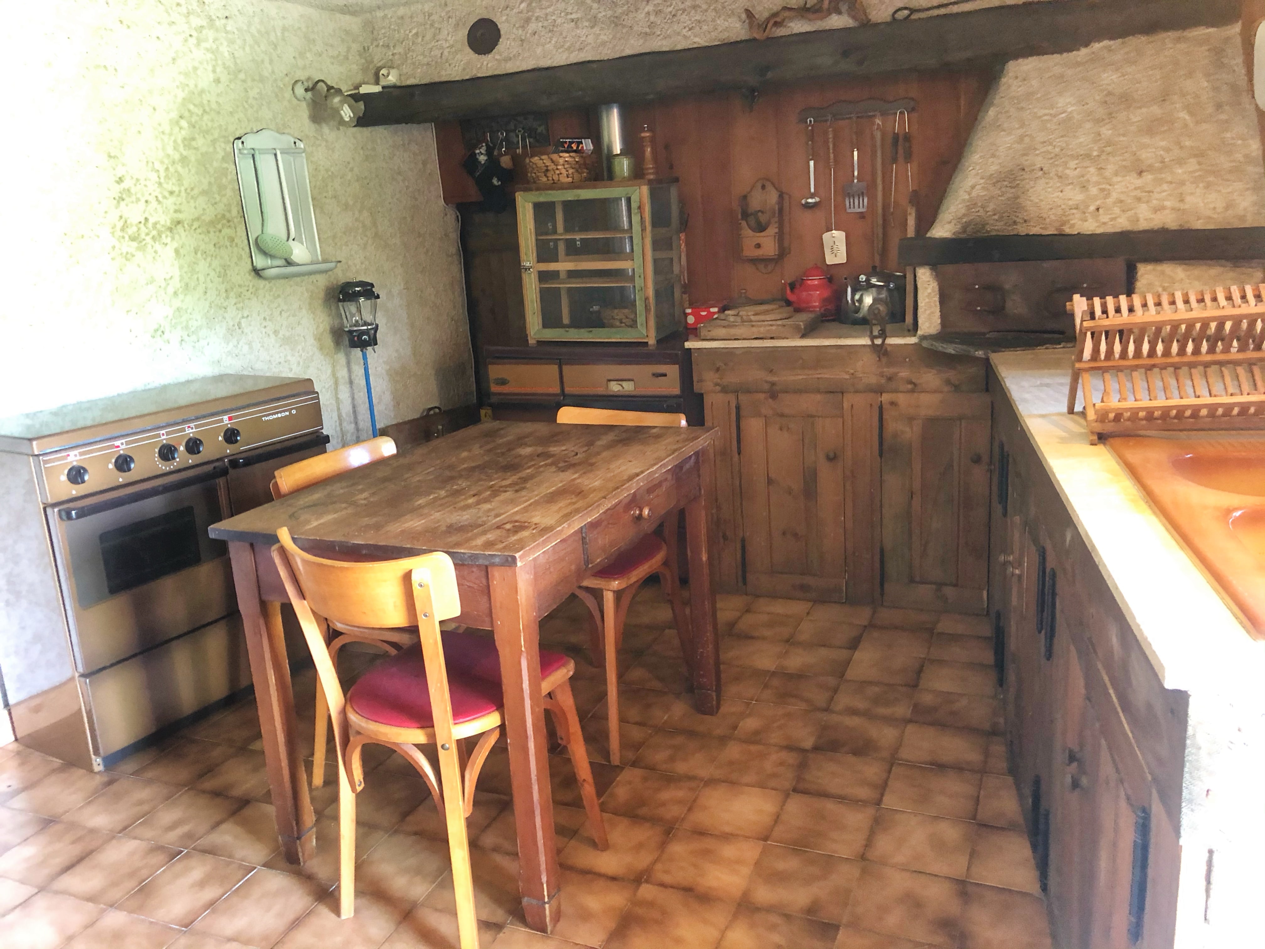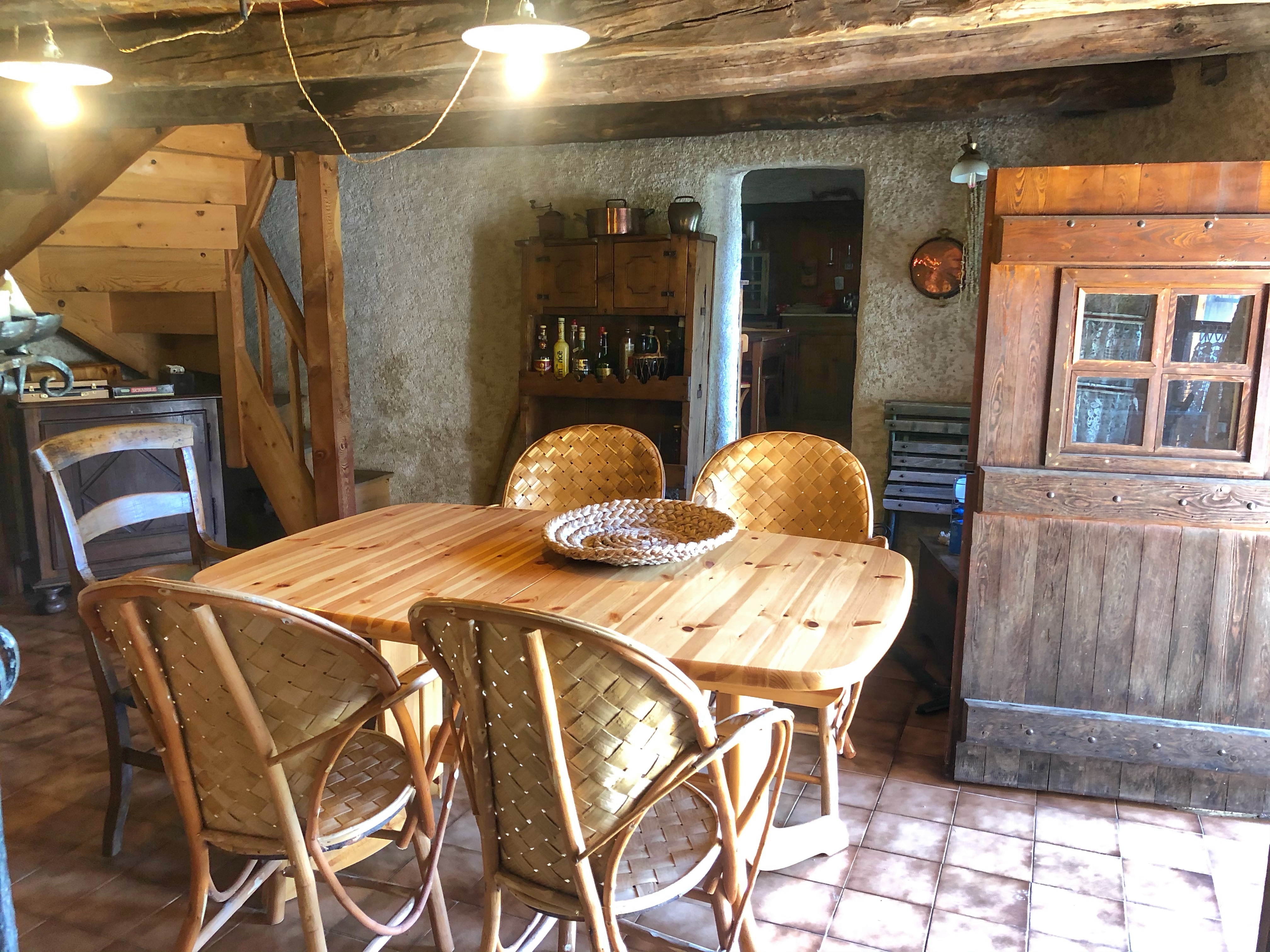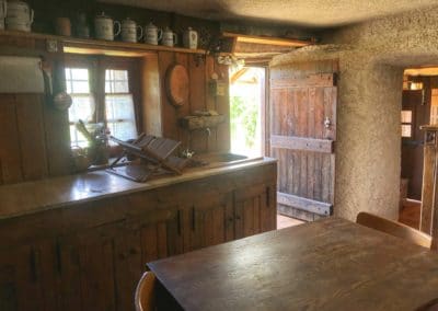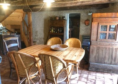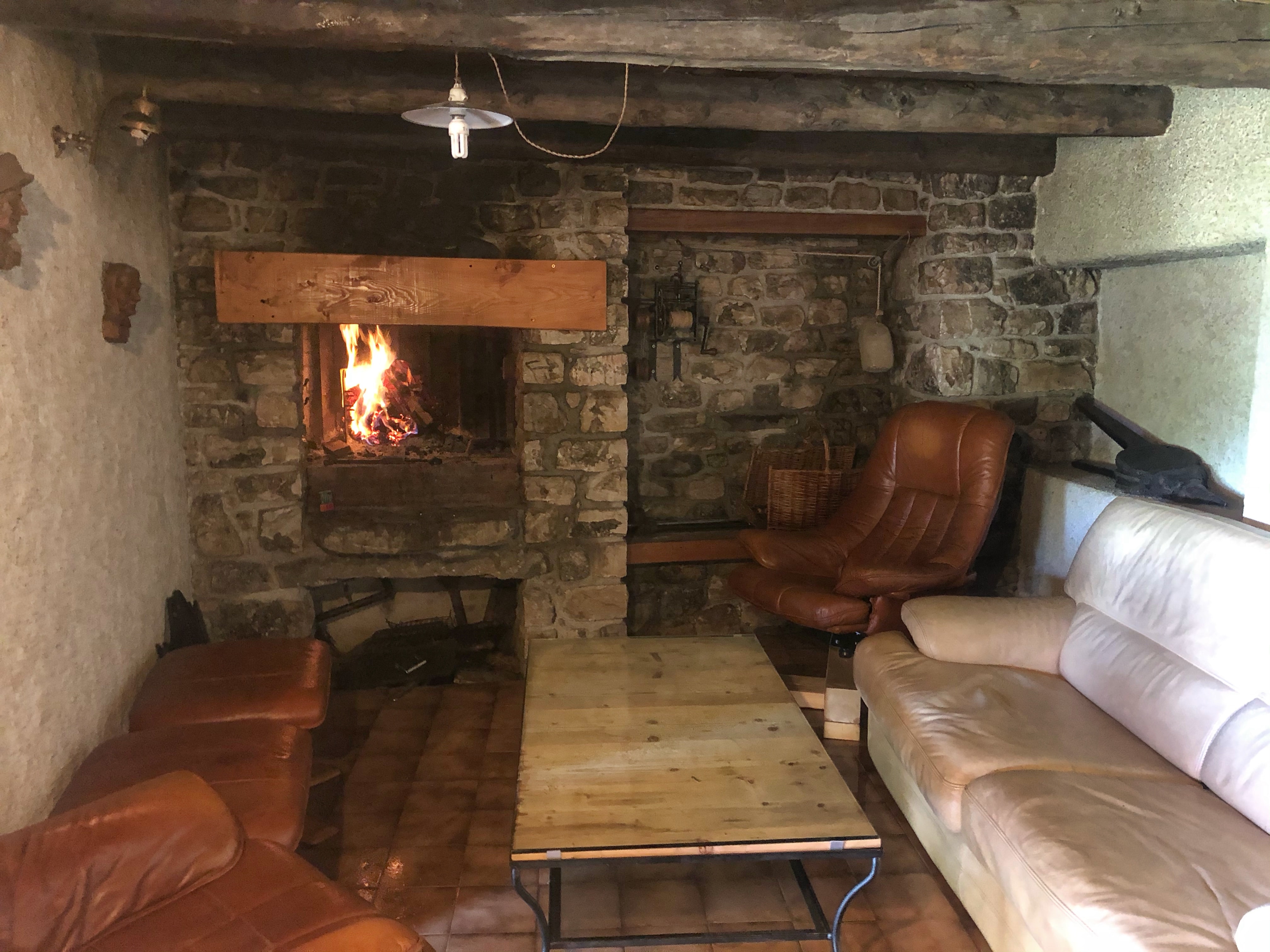• Lounge : sofa and armchairs, fireplace with turning spit, dining table, cosy corner with table and stove.